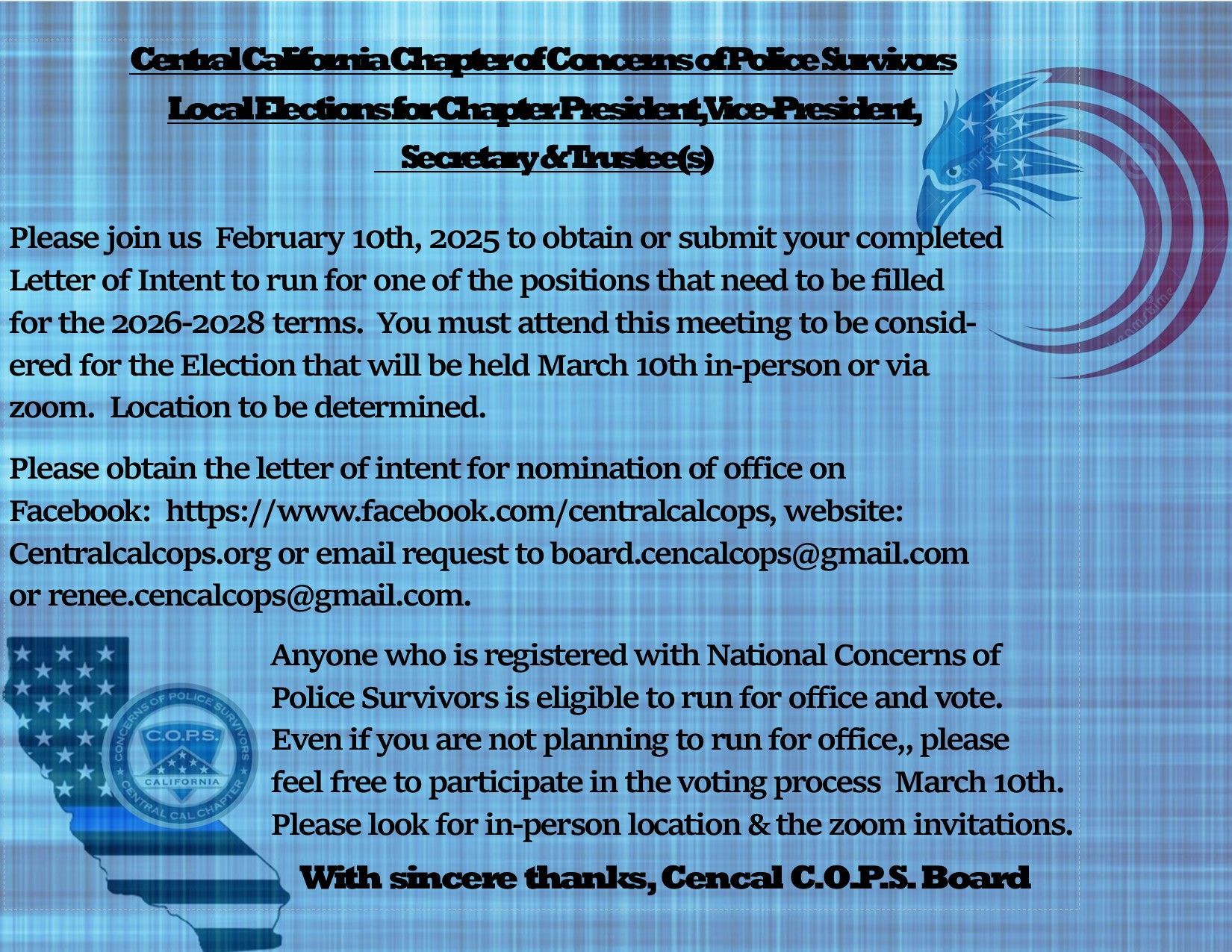 Tuolomne, Stanislaus, Mono, Mariposa, Merced, San Benito, Monterey, Fresno, Kings, Tulare, Inyo, Madera, Kern, San Luis Obispo